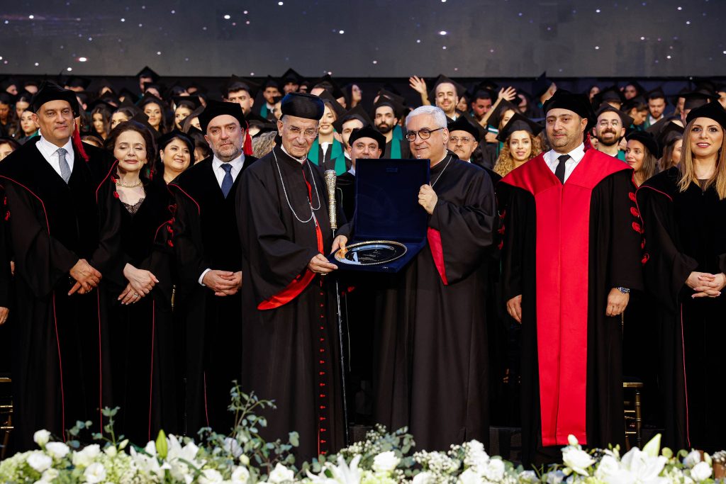 أضاف أن ما يزيد من جلال هذا اليوم وفرحه، هو حضور صاحب الغبطة والنيافة البطريرك الكاردينال مار بشارة بطرس الراعي، أب الكنيسة المارونية ومرجع القيم الوطنية والروحية ومنارتها. وقال: “إن حضوركم وتشريفكم لنا اليوم، يتجاوز التحية الرعوية الصرف، فهو علامة حب وعناق أبوي دافئ ورسالة دعم معنوي لهذه الجامعة التي انبثقت من رحم الكنيسة وستبقى وفية لرسالتها الثقافية والتربوية والوطنية في قلب الكنيسة والوطن”.