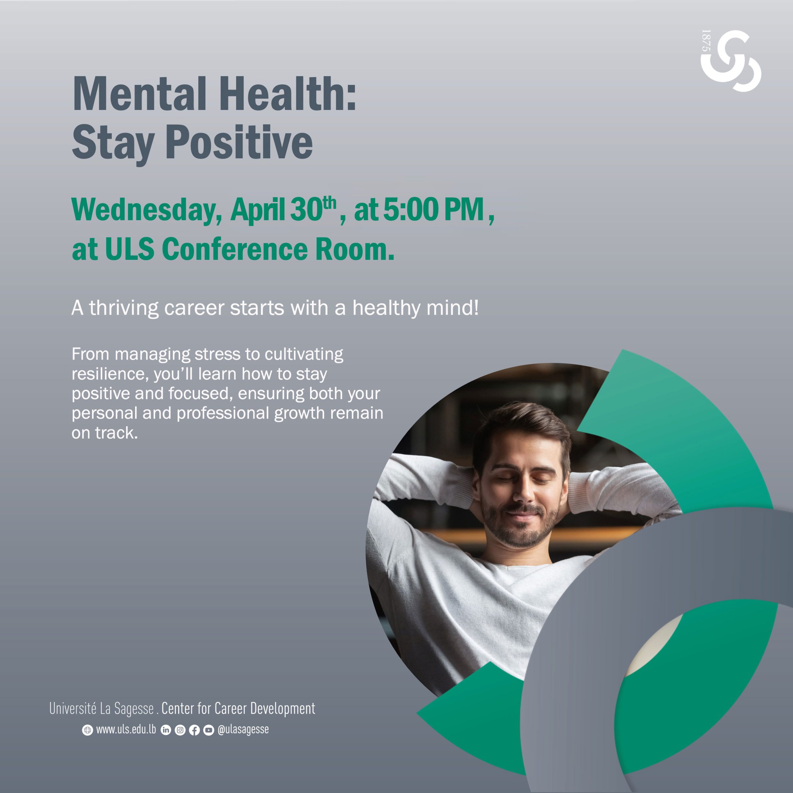 « All Events This event has passed. Mental Health: Stay Positive at the Center for Career Development April 30 - 17:00 « FxPro Trading Competition, 3rd Edition at the Faculty of Economics and Business Administration Beirut Marathon Medical Support by Physiotherapy Students from the Faculty of Public Health » This session was led by Dr. Cynthia Sfeir, Certified Coach. Add to calendar Google Calendar iCalendar Outlook 365 Outlook Live Details Date: April 30 Time: 17:00 - 18:00 Event Categories: Center for Career Development, Université La Sagesse Venue Conference Room, Université La Sagesse Main Campus Université La Sagesse Main Campus Furn El Chebbek, Beirut 0000 Lebanon Organizer Center for Career Development