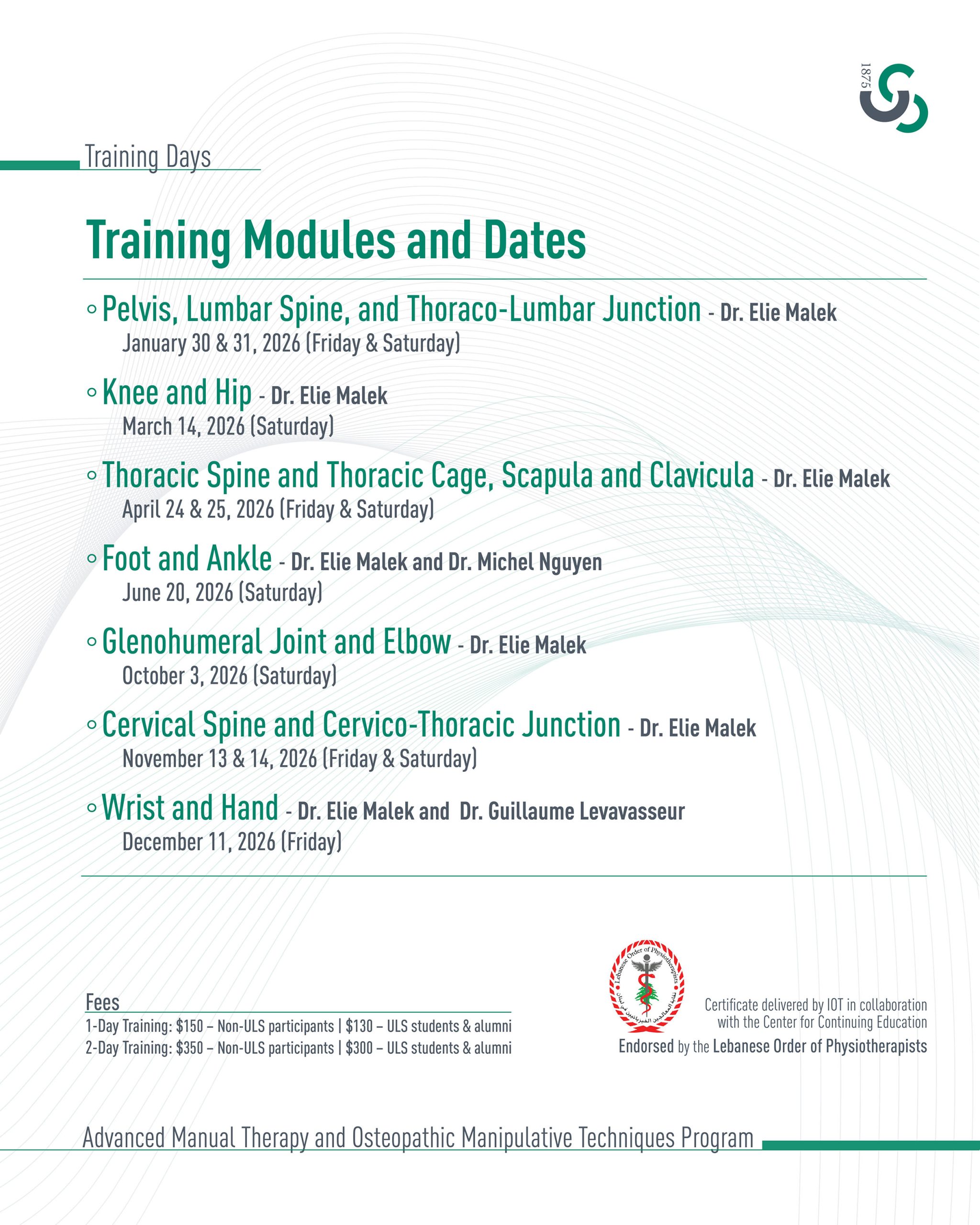 « All Events Advanced Manual Therapy and Osteopathic Manipulative Techniques Program January 30 - December 11 « Université La Sagesse inaugurated the fifteenth edition of the Inter-University Program on International Criminal Law and Procedure (IUP) Add to calendar Google Calendar iCalendar Outlook 365 Outlook Live Details Start: January 30 End: December 11 Event Categories: Faculty of Public Health, Upcoming Event Organizer Center for Continuing Education Venue Université La Sagesse – Main Campus Furn El Chebbak Lebanon + Google Map View Venue Website