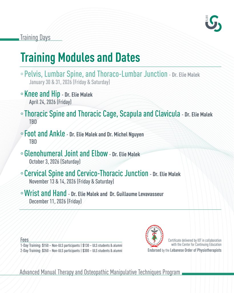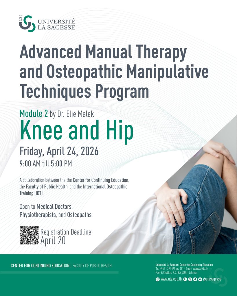 « All Events Advanced Manual Therapy and Osteopathic Manipulative Techniques Program January 30 - December 11 « لقاء جامع حول نسب يسوع وصلاة المزامير في جامعة الحكمة Université La Sagesse hosts Microsoft Skills Championship 2026 in Partnership with the Makhzoumi Foundation and ITLS » CCE Registration Form – Advanced Manual Therapy Program https://tinyurl.com/3tme9wnd Add to calendar Google Calendar iCalendar Outlook 365 Outlook Live Details Start: January 30 End: December 11 Event Categories: Center for Continuing Education, Faculty of Public Health, Upcoming Event Organizer Center for Continuing Education Venue Université La Sagesse – Main Campus Furn El Chebbak Lebanon + Google Map View Venue Website