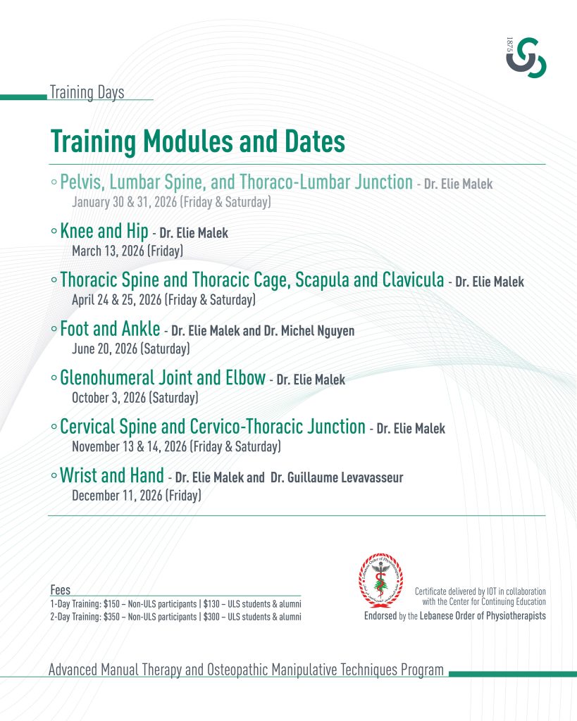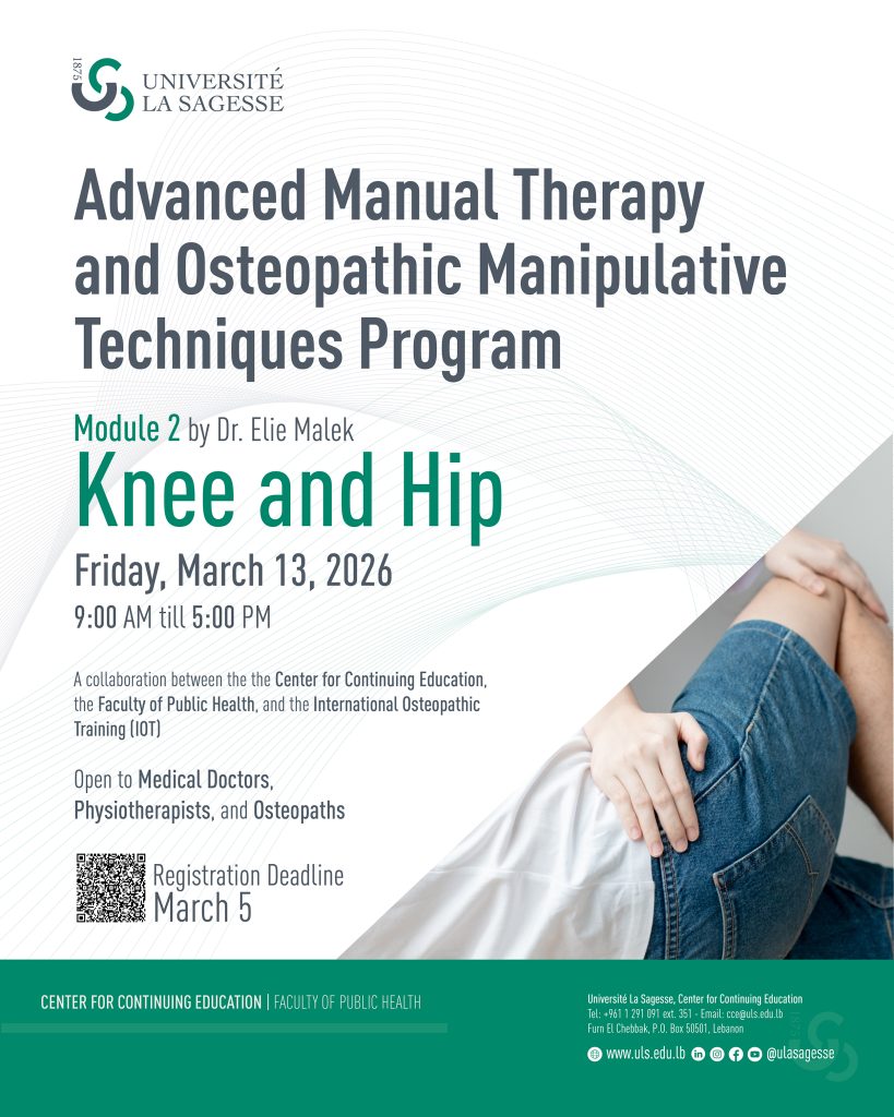« All Events Advanced Manual Therapy and Osteopathic Manipulative Techniques Program January 30 - December 11 « لقاء جامع حول نسب يسوع وصلاة المزامير في جامعة الحكمة Université La Sagesse hosts Microsoft Skills Championship 2026 in Partnership with the Makhzoumi Foundation and ITLS » Add to calendar Google Calendar iCalendar Outlook 365 Outlook Live Details Start: January 30 End: December 11 Event Categories: Center for Continuing Education, Faculty of Public Health, Upcoming Event Organizer Center for Continuing Education Venue Université La Sagesse – Main Campus Furn El Chebbak Lebanon + Google Map View Venue Website