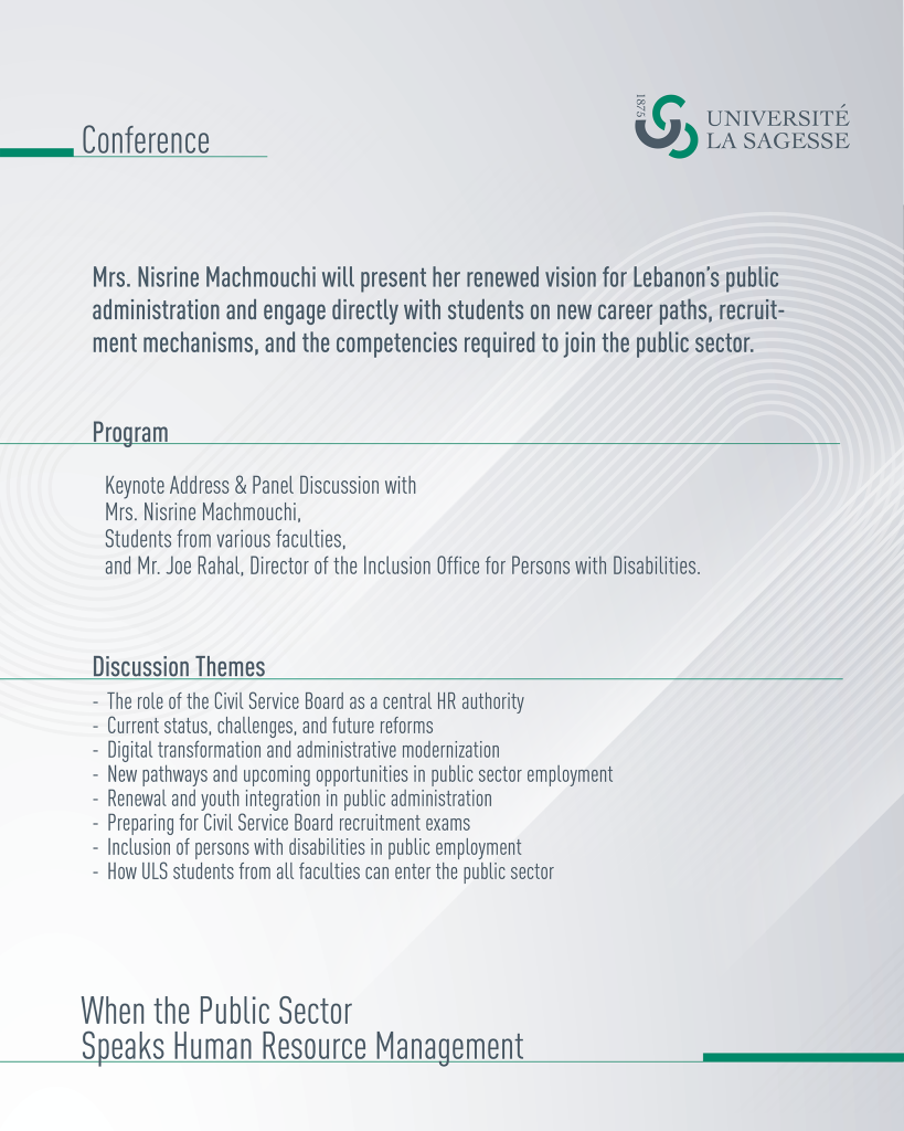 « All Events When the Public Sector Speaks Human Resource Management December 17 - 17:30 « Imaging the Future: Advancing Innovation and Radiation Protection Toward Smarter Medical Interventions – Beirut 2025 Advanced Manual Therapy and Osteopathic Manipulative Techniques Program » Add to calendar Google Calendar iCalendar Outlook 365 Outlook Live Details Date: December 17 Time: 17:30 - 18:30 Event Category: Upcoming Event Organizer Université La Sagesse Venue Université La Sagesse – Main Campus Furn El Chebbak Lebanon + Google Map View Venue Website